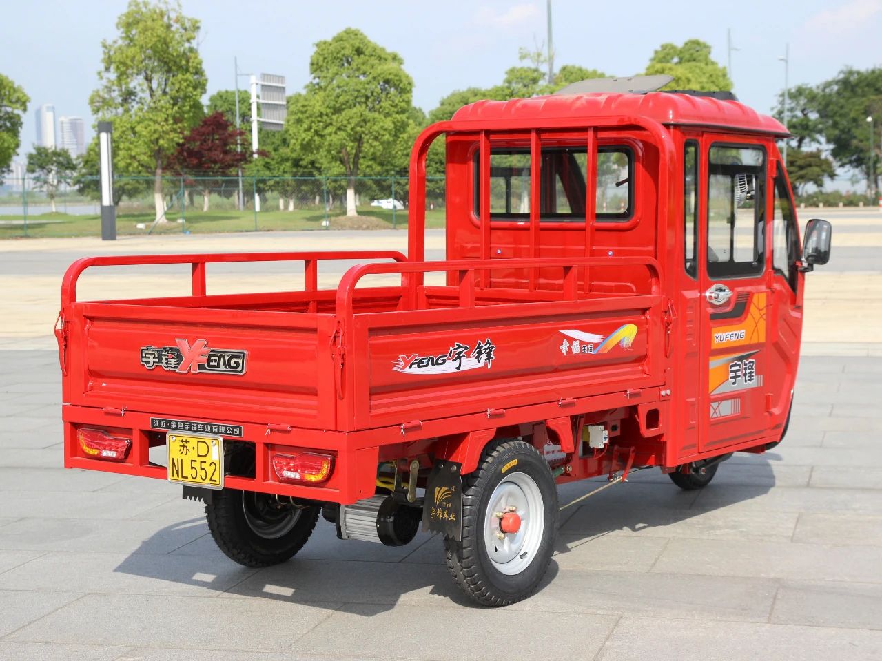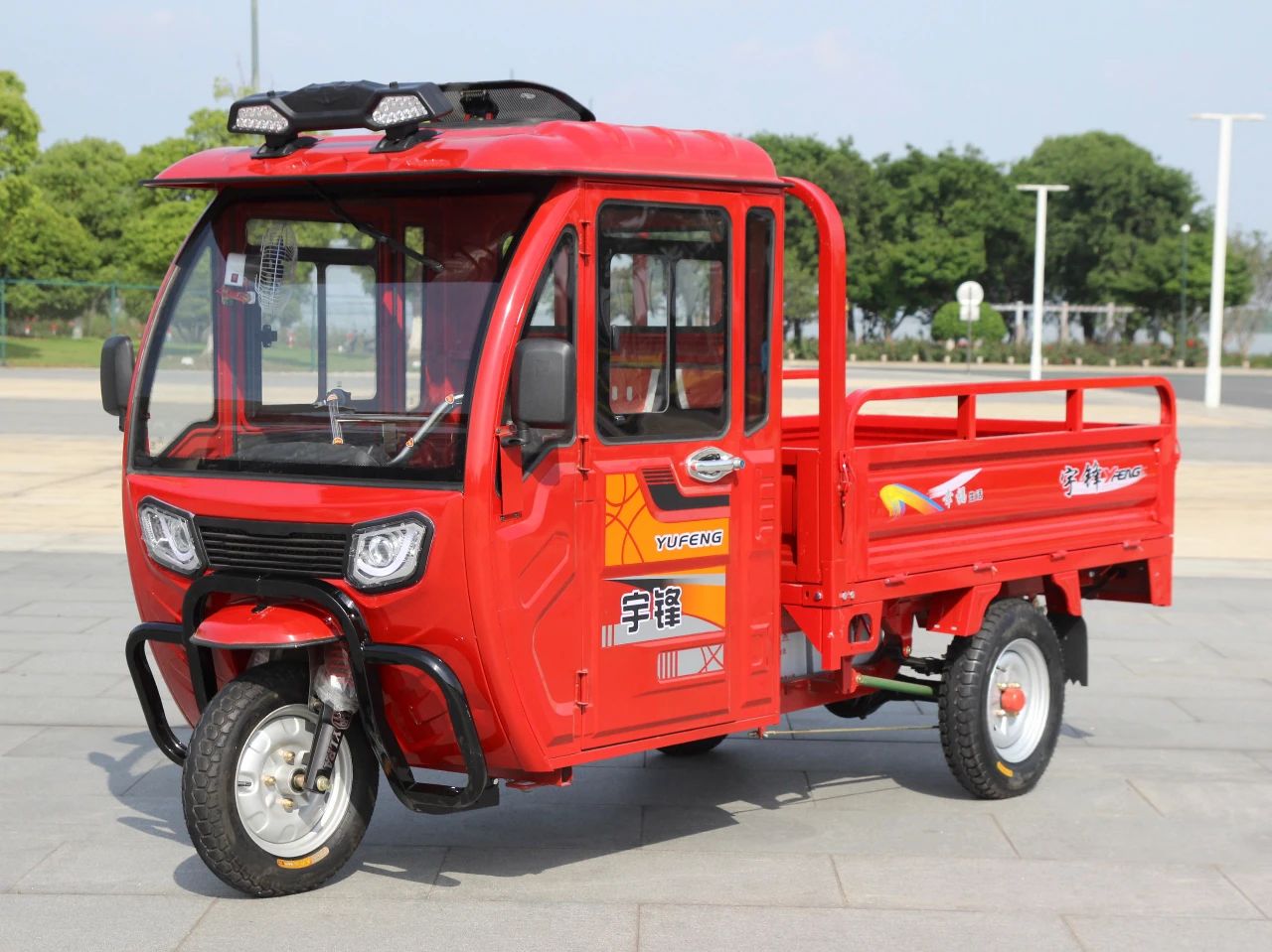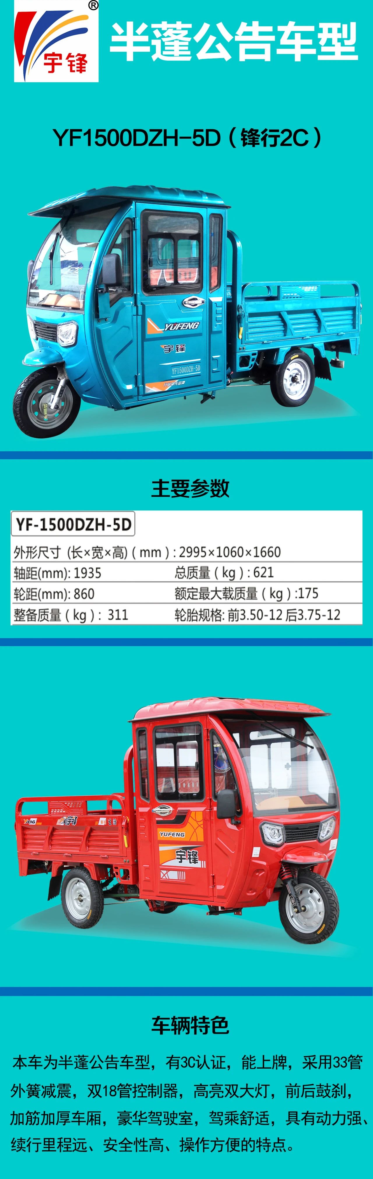 半蓬电动三轮车,具有载荷大、驾乘安全、遮风挡雨的特点,是三轮车产品系列中非常畅销的车型,本篇给大家介绍半蓬公告车型:YF1500DZH-5D(简称5D),常规名称:锋行2C。第一眼,你会被靓丽的烤漆所吸引,这是宇锋的特色,是自动化前处理和自动化烤漆线的杰作。轿车级烤漆,多种颜色可选。大气的高亮双大灯,让夜晚变得清晰明亮,豪华驾驶室,宽敞舒适。【车辆不同角度展示】配备前加粗护杠、高亮顶灯天窗、风扇、音乐,为驾乘提供方便流线型设计,浑然一体,美观大方【更多在售上牌车型】