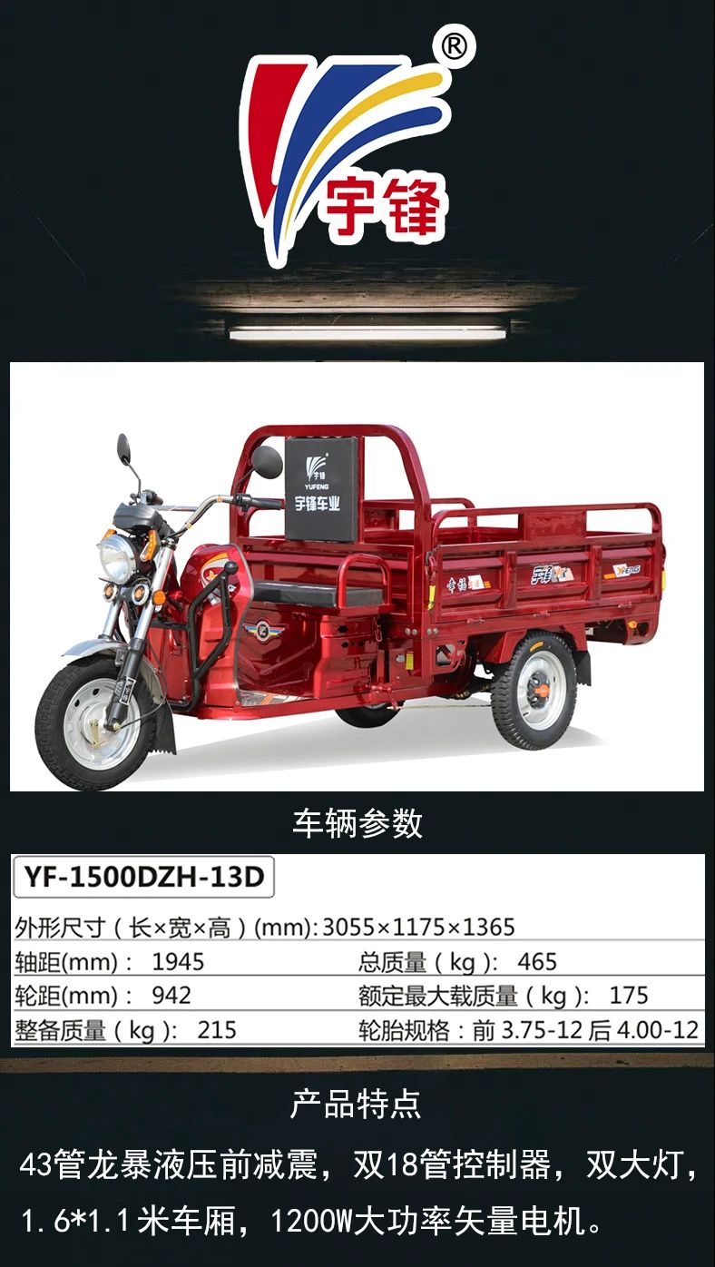 【评论】公告车13D由于其车型大小适中,1.6米的车厢长度,是三轮车行业的最常见通用车型,和12D(1.3米锋泰,三开门车型)形成完美的搭配,本车具有动力强、通用性好、车厢加筋加固、安全系数高和驾乘方便的几个特色,深受终端消费者的好评,也是一款性价比非常高的一款通用车型。