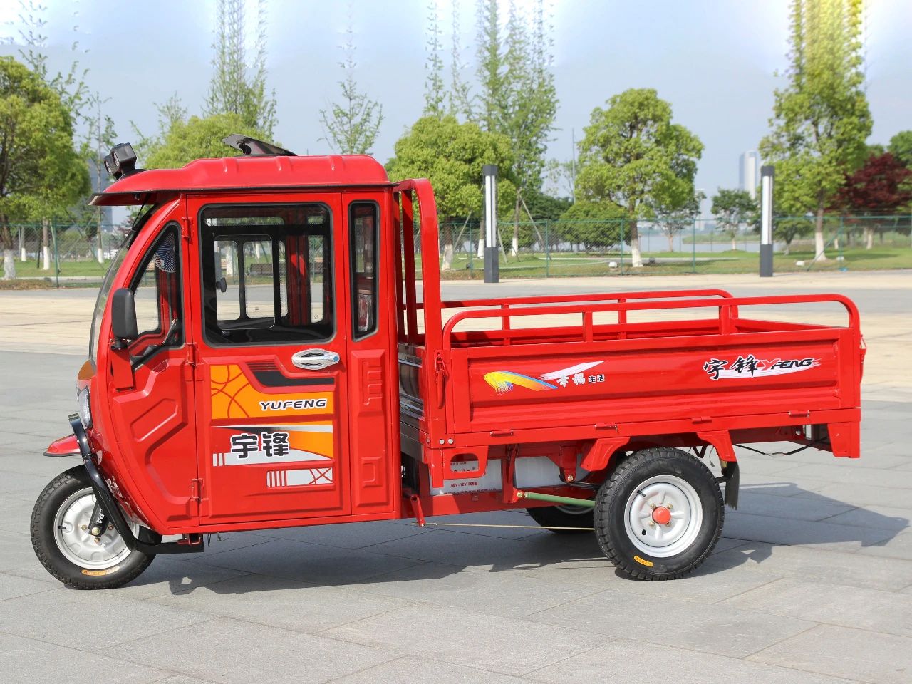 半蓬电动三轮车,具有载荷大、驾乘安全、遮风挡雨的特点,是三轮车产品系列中非常畅销的车型,本篇给大家介绍半蓬公告车型:YF1500DZH-5D(简称5D),常规名称:锋行2C。第一眼,你会被靓丽的烤漆所吸引,这是宇锋的特色,是自动化前处理和自动化烤漆线的杰作。轿车级烤漆,多种颜色可选。大气的高亮双大灯,让夜晚变得清晰明亮,豪华驾驶室,宽敞舒适。【车辆不同角度展示】配备前加粗护杠、高亮顶灯天窗、风扇、音乐,为驾乘提供方便流线型设计,浑然一体,美观大方【更多在售上牌车型】