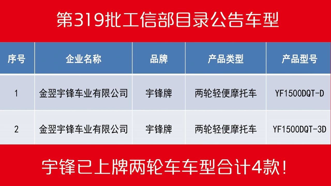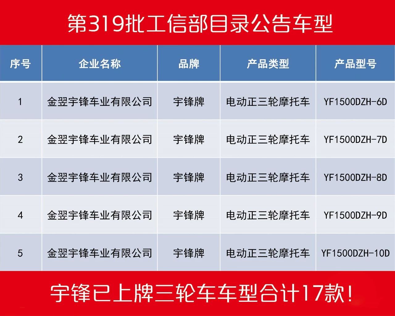 在新国标执行的第三天,也就是4月17日,工信部在官方网站上正式公示了第319批《道路机动车辆生产企业及产品公告》,金翌宇锋车业有限公司的“宇锋”牌三轮车又有5款车型上榜!另外,在第319批目录公告的两轮轻便摩托车中,宇锋也有两款两轮轻便摩托车上榜!