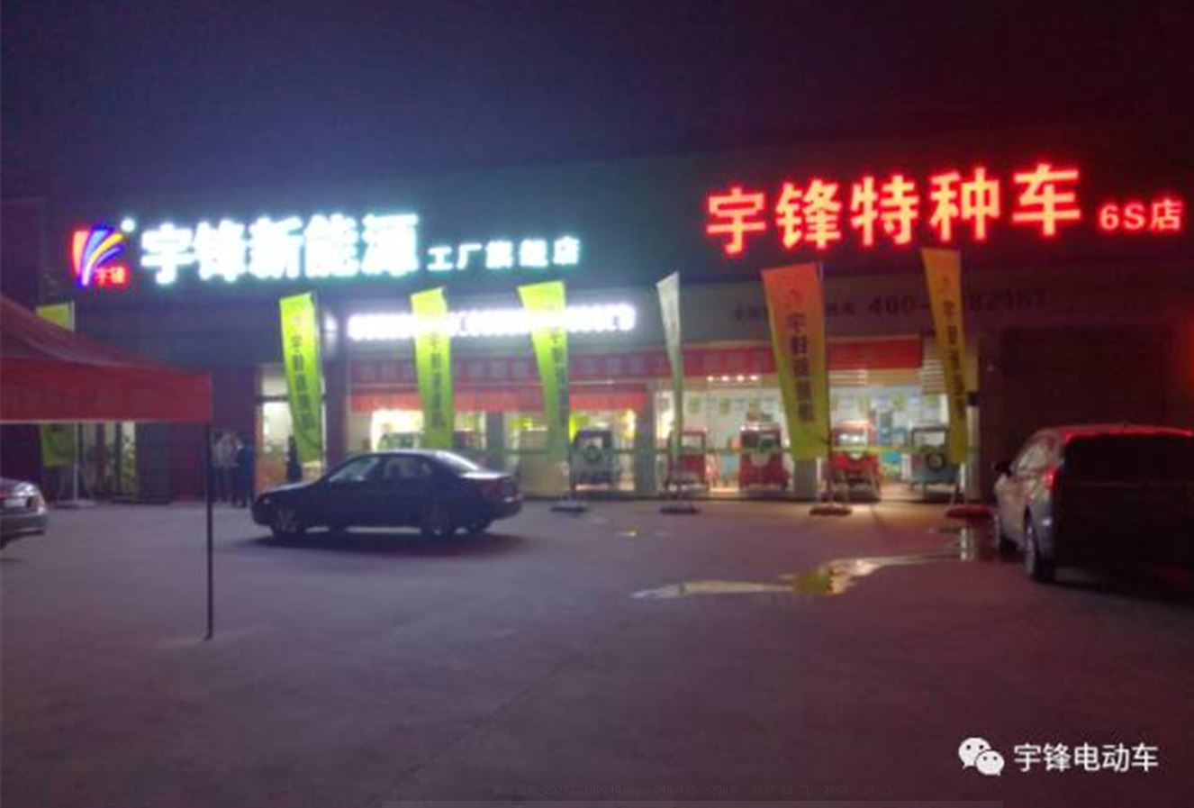夜间的宇锋工厂店,闪亮着一种大气和特色。 靓丽店面从开业开始,事业辉煌从开店开始,生意红火从开张开始,开店吉祥从祝福开始。我们仅仅是做了一块模板,我们将与宇锋的经销商们一起,共同打造宇锋新能源汽车最完美的终端店面体系。