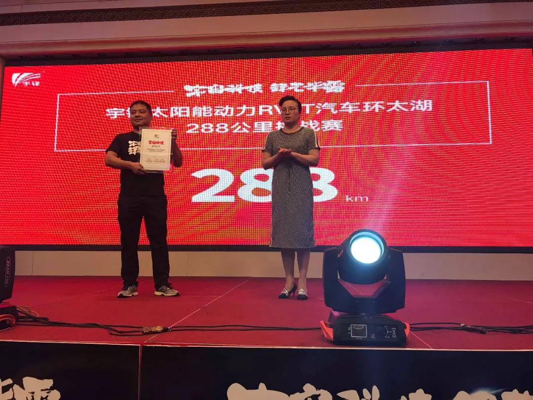 宇锋科技太阳能动力RV-T,这款太阳能四门电轿新产品能够环太湖挑战288公里,这也必将来载入新能源交通工具史册。同时,宇锋太阳能动力电轿挑战288公里环太湖挑战赛也成功获得了协会、媒体荣誉证书。江苏自行车电动车协会主任李灵芝女士对宇锋太阳能四轮电轿成功挑战288公里,颁发见证证书,见证这一产品奇迹。